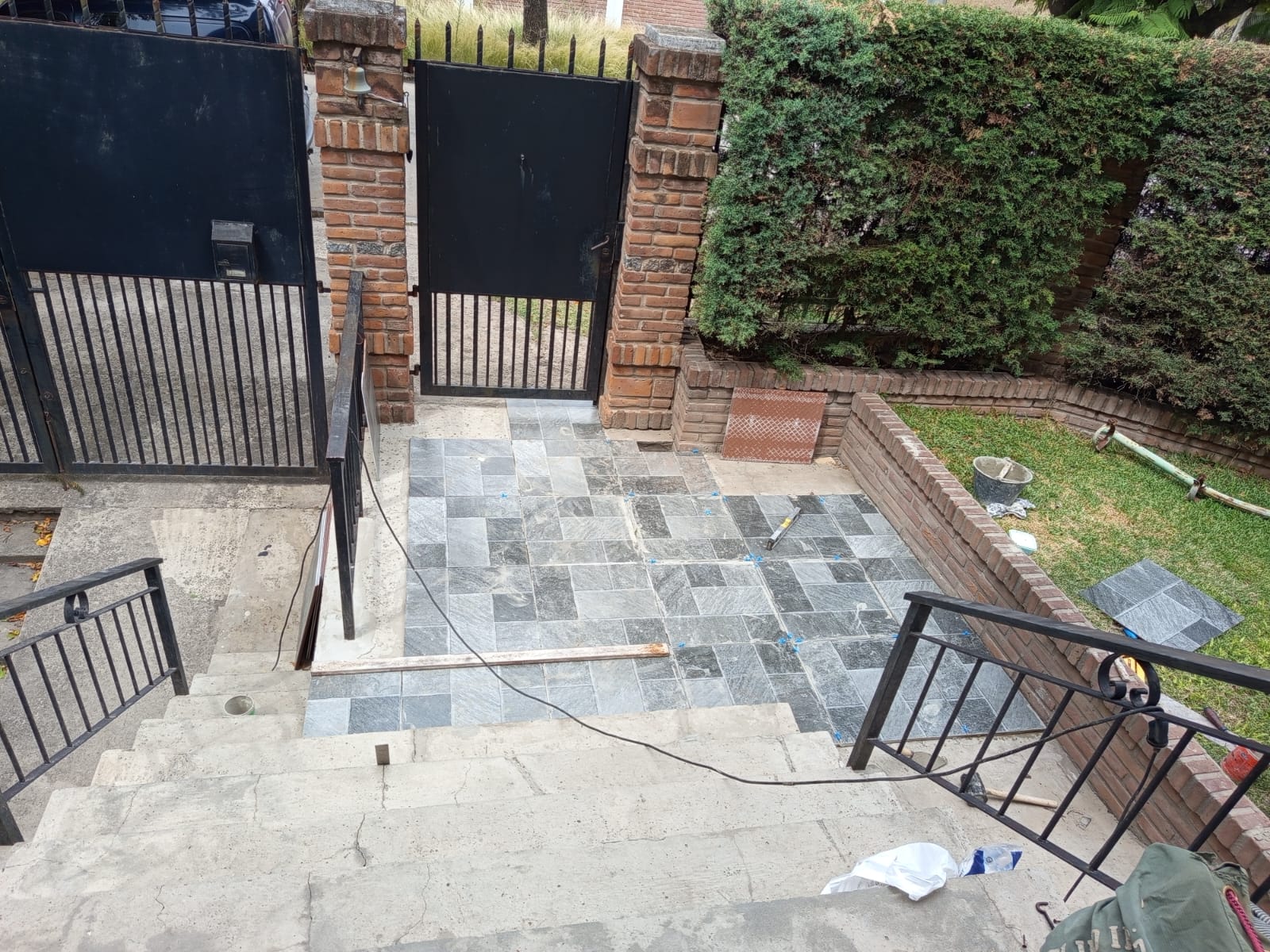 En la casa de Ana renovamos todo el acceso: colocamos cerámicas en el porche de entrada, armamos la carpeta con nivelación y colocamos ladrillos para una vereda rústica en el perímetro público. Un ingreso prolijo, resistente y con mucha personalidad.